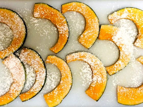 ・カボチャを切り両面に小麦粉を振る。