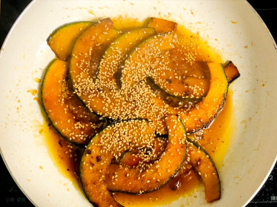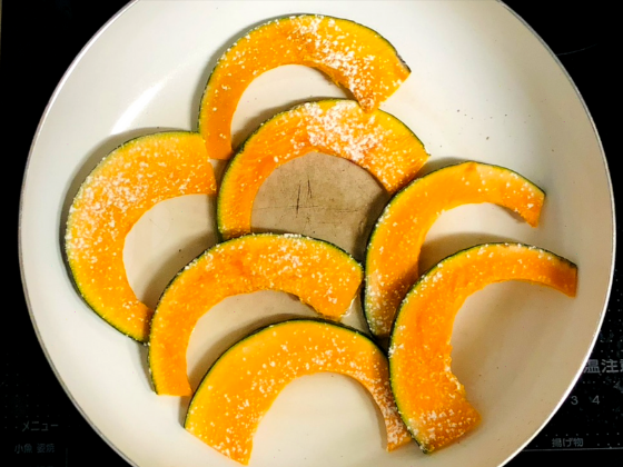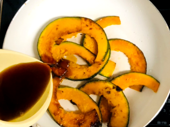 ① フライパンにサラダ油を熱して、カボチャを両面よく焼き上げる。
