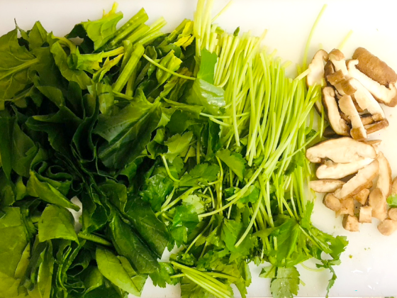 ・ほうれん素、三つ葉(茎と葉を分ける)、椎茸は食べやすい大きさにカットしておく。