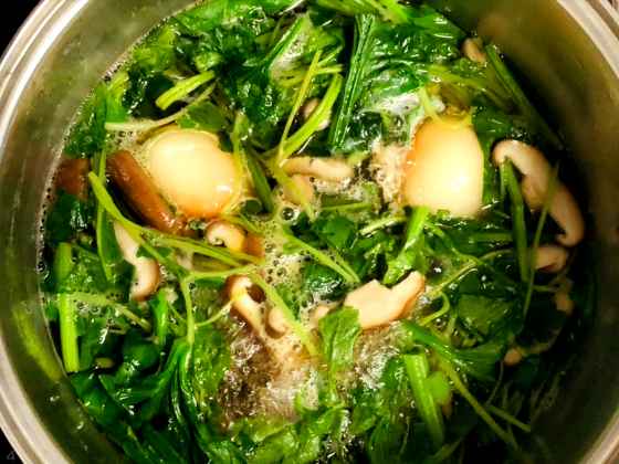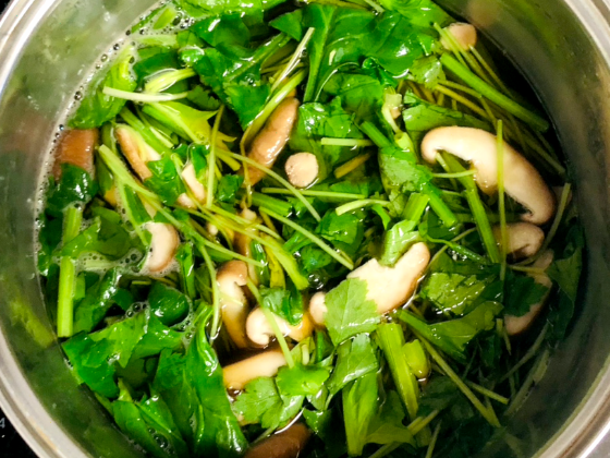 ① 鍋にお吸い物調味料を加えて中火で熱し、煮立ったらほうれん草・三つ葉(三つ葉は茎の部分だけ)椎茸を入れる。